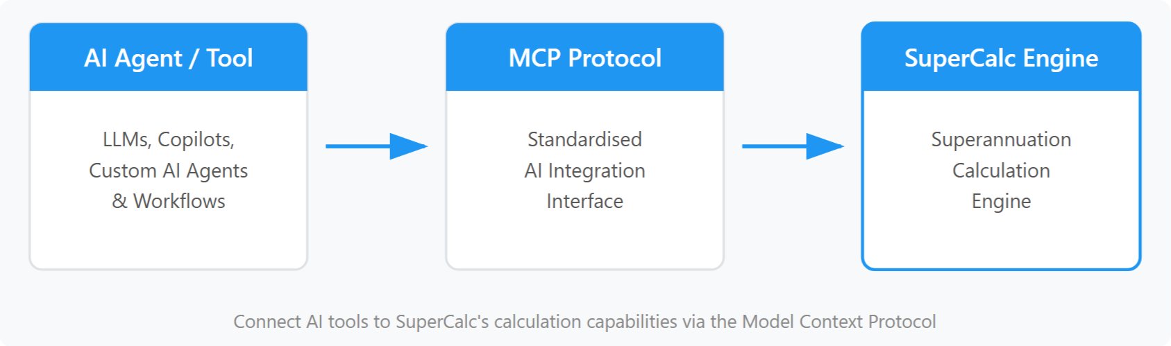 The MCP server fits seamlessly into existing toolchains without custom development, letting you embed superannuation calculation expertise into the platforms your teams already use.